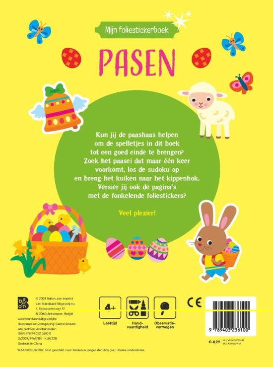 Leuk spelletjesboek in het teken van Pasen boordevol spelletjes en kleurplaten. Met fonkelende foliestickers om de pagina's te versieren. Voor uren speel- en stickerplezier!