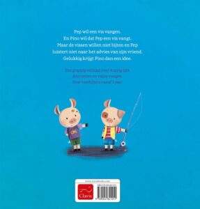 Pep wil een vis vangen. En Pino wil dat Pep een vis vangt. Maar de vissen willen niet bijten en Pep luistert niet naar het advies van zijn vriend. Gelukkig krijgt Pino dan een idee. Een grappig verhaal over respect, delen en samenwerken. Voor varkentjes vanaf 4 jaar.