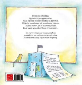De eerste schooldag. Uppie is blij en opgewonden, maar hij voelt ook rare kriebels in zijn buik. Hij krijgt een nieuwe juf, een nieuw klaspop. Alles is nieuw. En er is zoveel lawaai! In de pauze wordt het Uppie even te veel ...